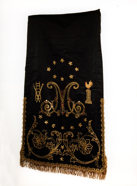 que destaca el bordado de una cruz y un corazón de plata atravesado por